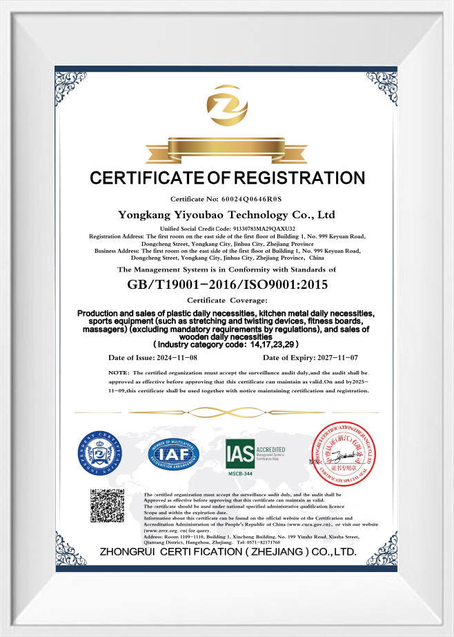 永康义友宝科技有限公司成立于2017年,位于浙江省永康市东城街九定路528号5号楼4单元—"世界硬件之都" 公司占地面积5000多平方米,目前拥有员工200余人,其中包括5名高级专业经理、10名高级研发工程师和8名质量控制工程师。该公司由模具制造、产品研发、质量控制、生产、销售、管理和法律事务部门组成。2024年,公司获得GB/T19001-2016/ISO9001:2015管理体系认证。